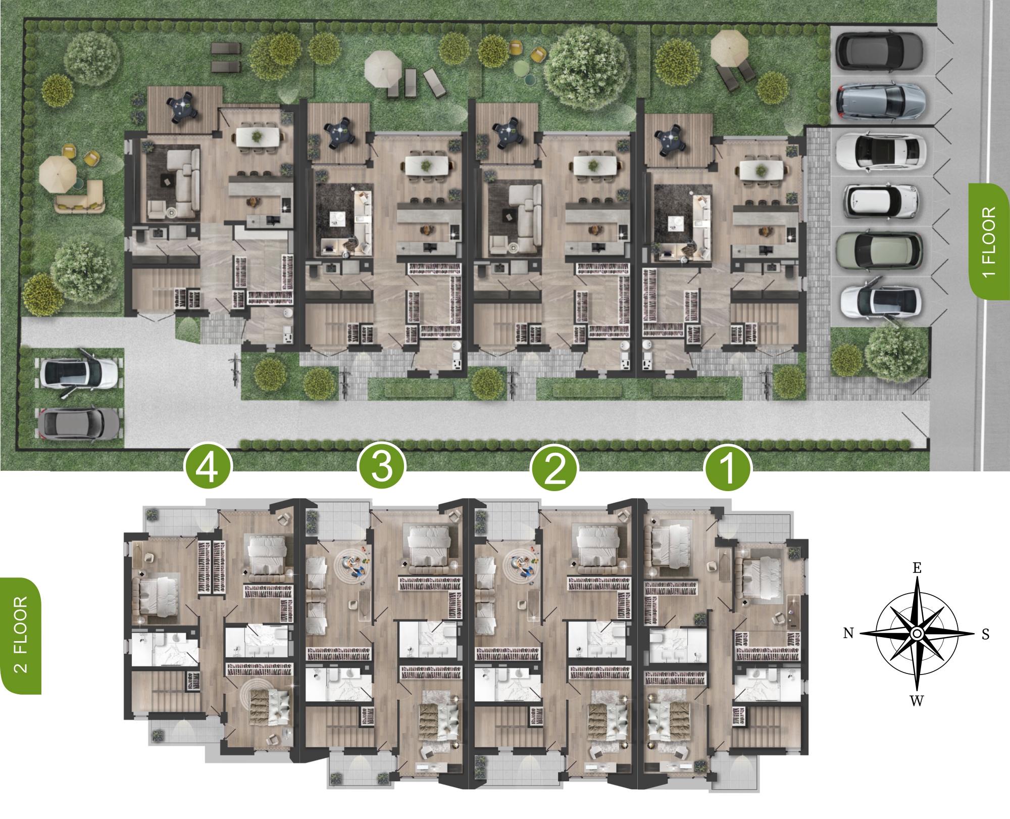 Houses are delivered according to the BDS standard, with fully completed facades and external landscaping.