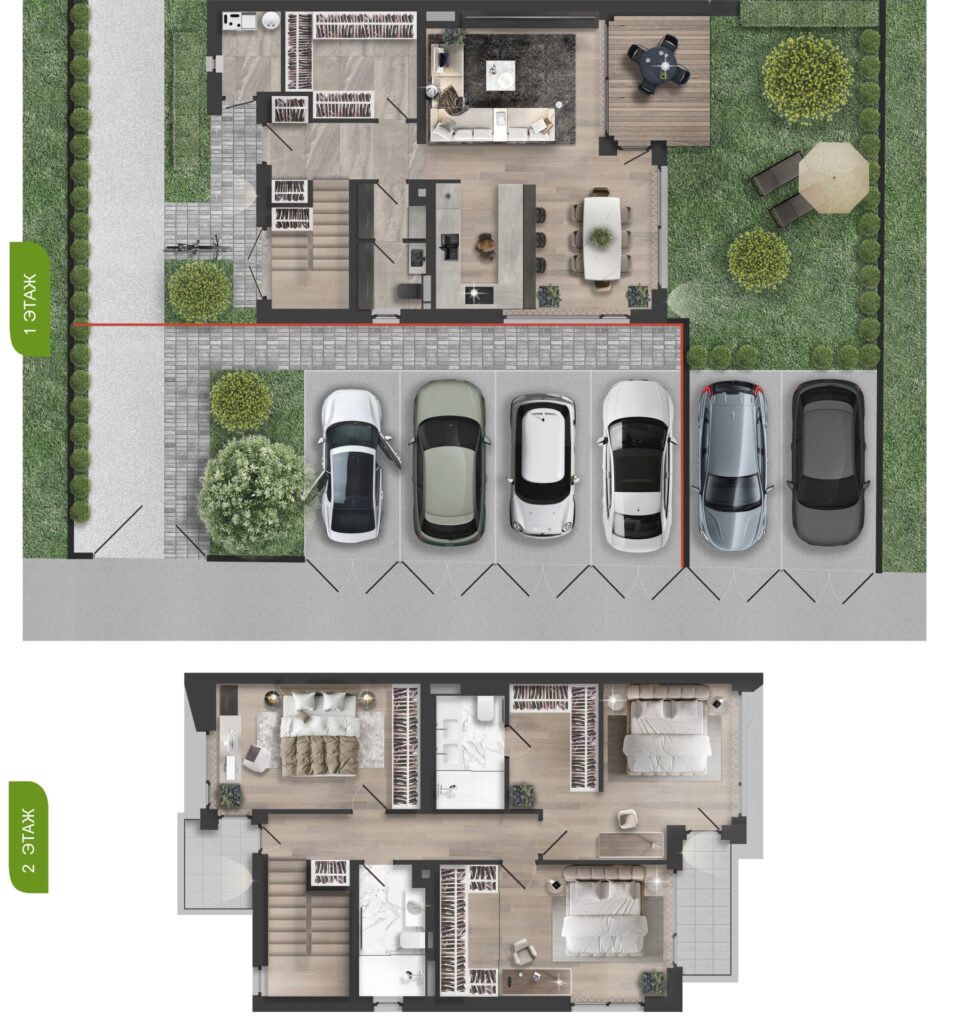 Все дома — двухэтажные, с собственным двором и двумя парковочными местами: